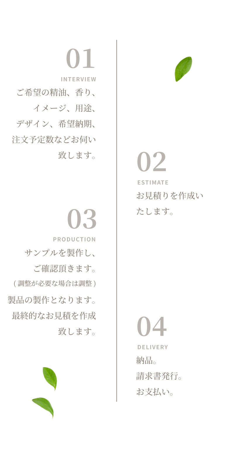 香りを楽しむだけでなく、精油が本来持っている天然の作用を最大限に活かすために100%天然精油(分析シート付き)を使用しブレンドいたします。